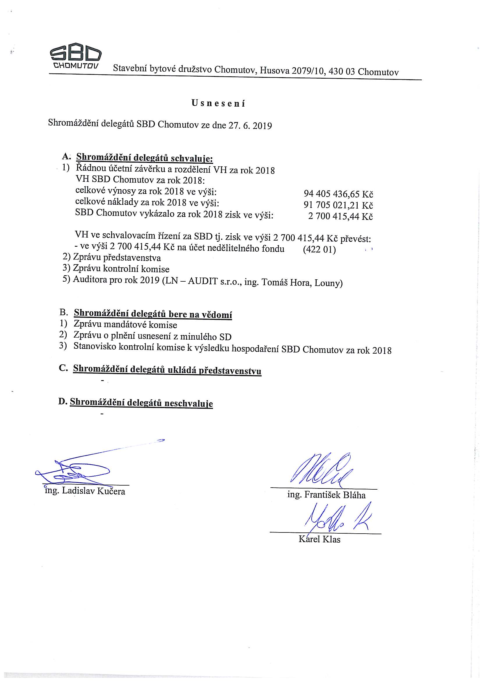 Usnesení ze shromáždění delegátů 2019